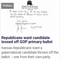 Meanwhile, the Kansas Attorney General had earlier filed a motion in Shawnee County District Court to rule that out-of-state candidates were ineligible to run for statewide office. The argument was based on a number of statutes relating to elections that indirectly hint at ineligibility. For example, one law authorizes the Kansas Department of Transportation to put an honorary sign up in the Governor's hometown. Since the Kansas DOT can't put up a sign in The Bronx it is implied the candidate must be a Kansan.